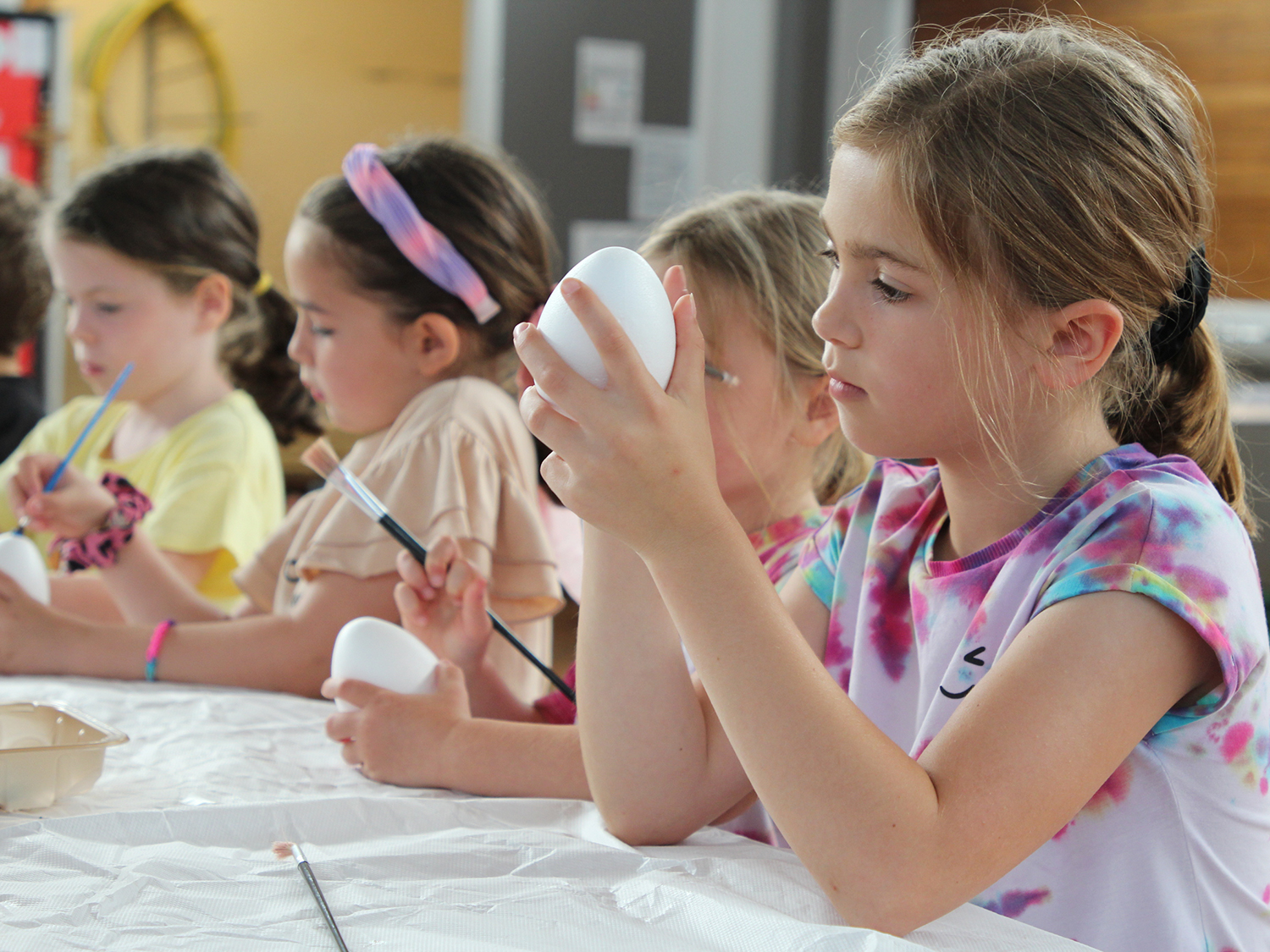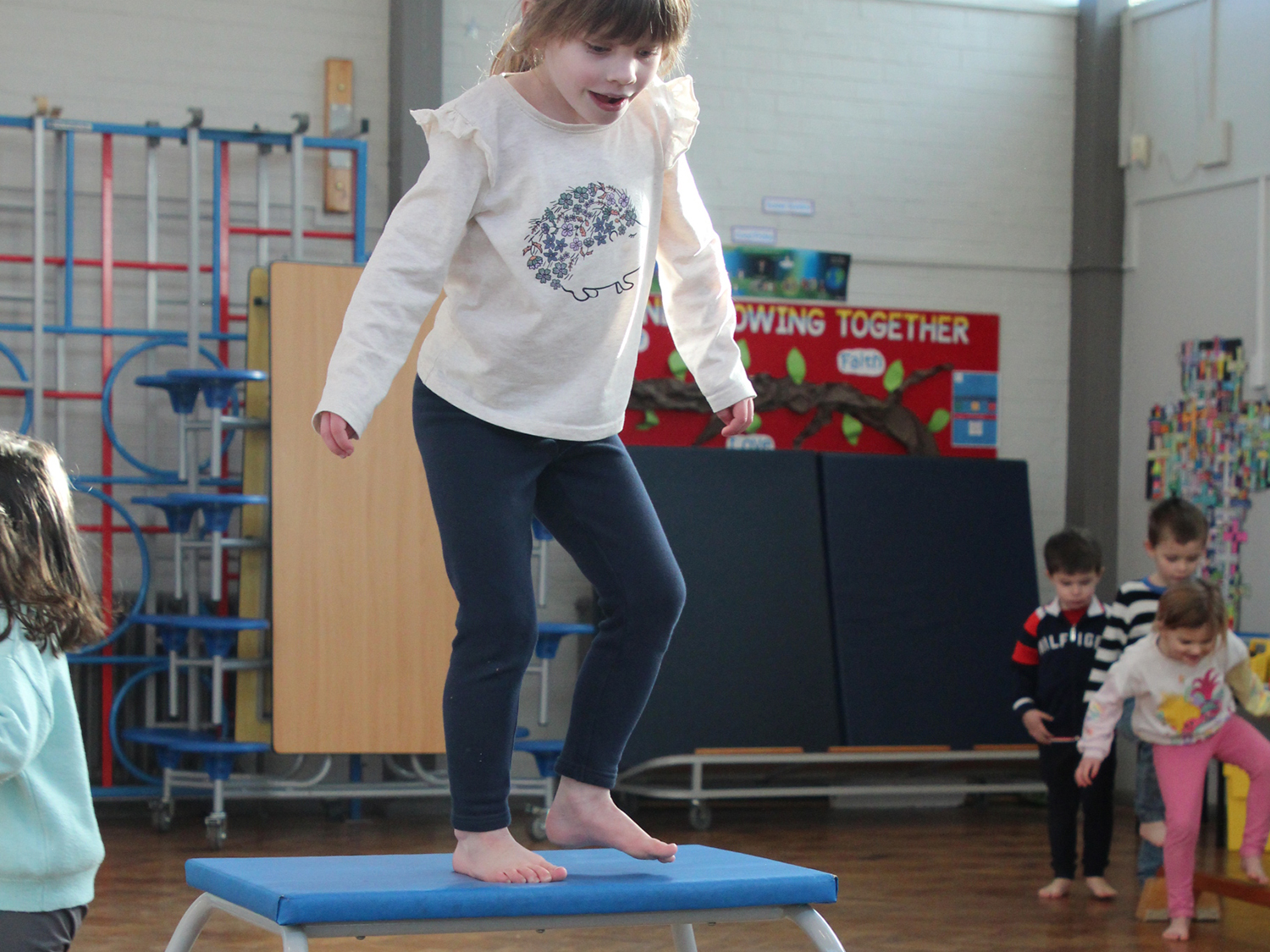 We are lucky to have access to a large playing field and tarmac playground complete with a trim trail and outdoor gym, perfect for all kinds of sports and activities. We head outside as often as we can but due to the good old British weather, we do have to consider rainy days. The main hall is available to us for indoor sports and games, plus pop up tables for lunch/snack time. We also use this area for craft activities and table top games.