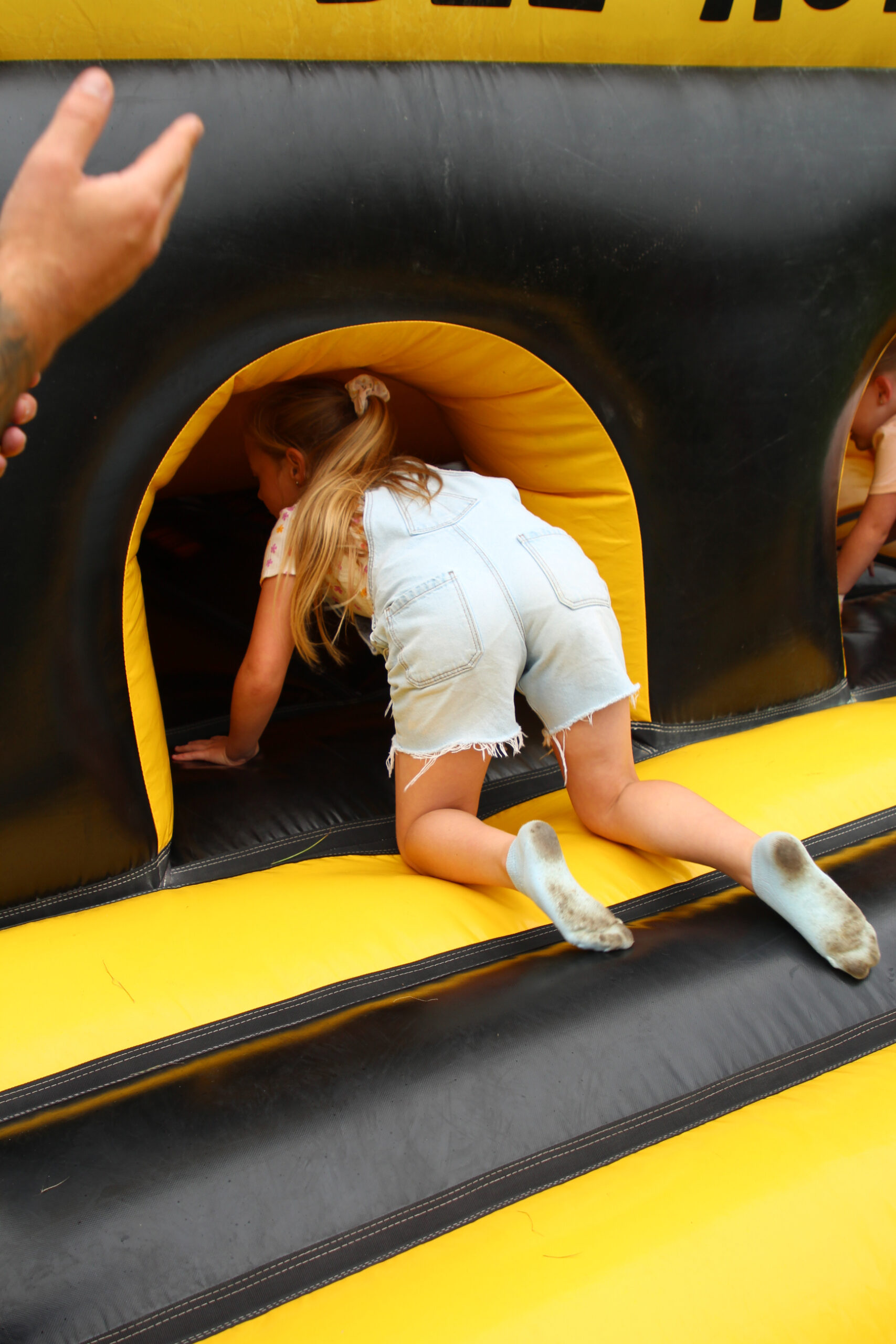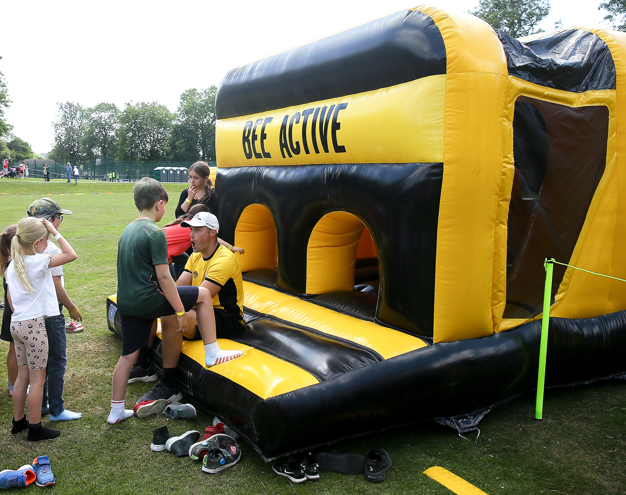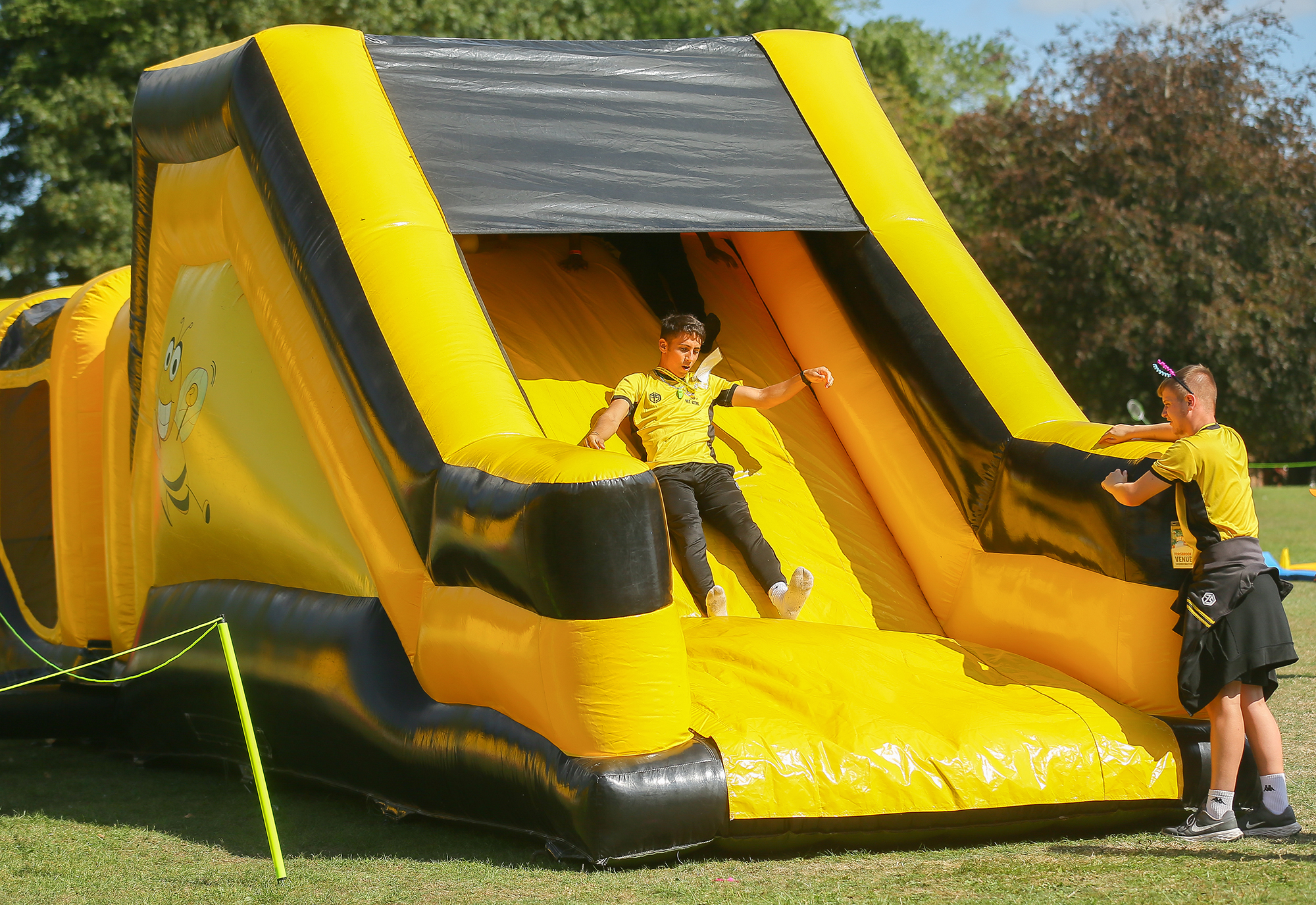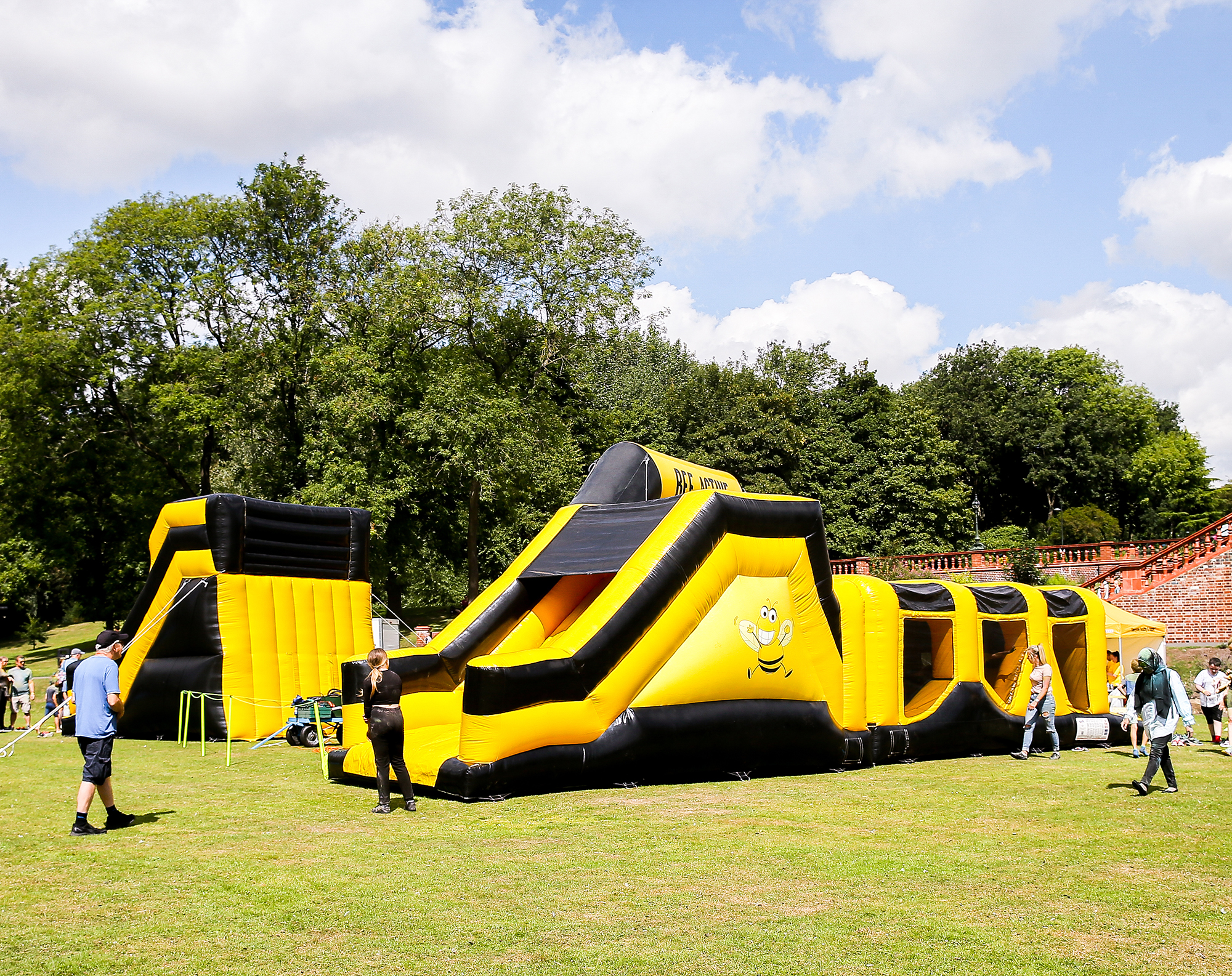 Featuring a twin-lane setup, this course offers the ideal platform for head-to-head races or engaging obstacle challenges that will ignite your competitive spirit. The course consists of two interconnected sections, each filled with bee-rilliant challenges. Navigate through hills, tangled mangles, and bish bash barriers, and master inflatable X-shaped bish bash obstacles before climbing steps and sliding to victory!